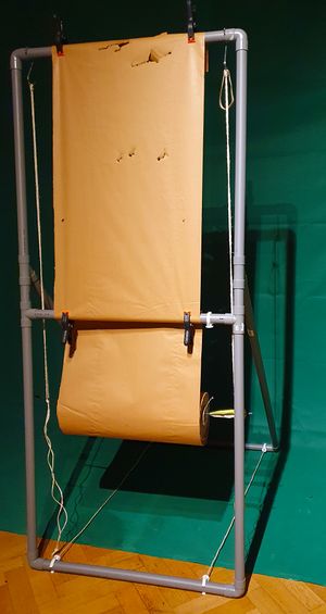 * 1 metalen staaf, diameter 1 cm om papieren rol te dragen. | * 1 metalen staaf, diameter 1 cm om papieren rol te dragen. | ||