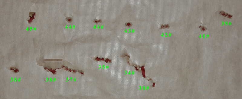 * Uit het patroon is duidelijk op te maken dat de pijlen tot en met 68# te slap zijn voor deze setup. | * Uit het patroon is duidelijk op te maken dat de pijlen tot en met 68# te slap zijn voor deze setup. | ||