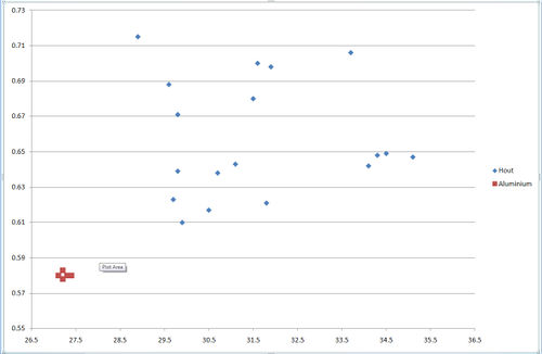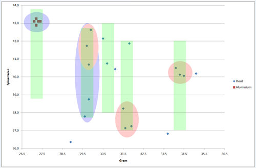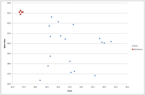 • In deze chart zie je dat aluminium pijlen (rode vierkantjes) veel beter bij elkaar groeperen qua gewicht en spine waarde, de houten pijlen zijn erg verschillend. Bij de selectie van de schachten zijn die genomen uit een doos met als markering:40-45#. In werkelijkheid zitten de waarden tussen 36 en 42.