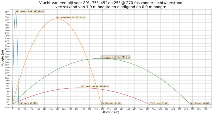 ** De vorm van de trajecten is dezelfde voor de 200 fps en de 270 fps pijl, enkel de hoogte en afstand is verschillend. | |||