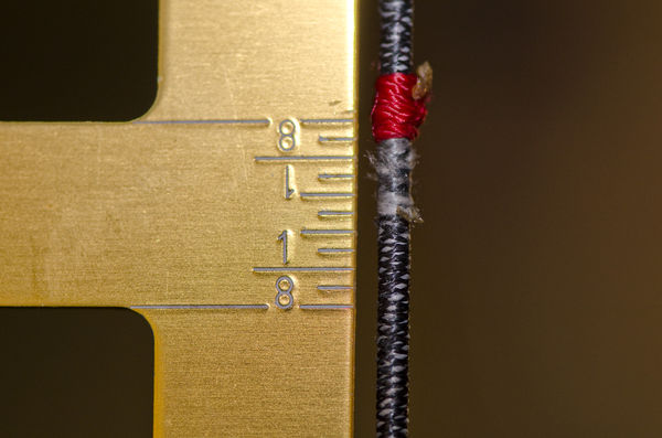 - Wanneer de pijl te los op de pees zit, gebruik wat flosdraad om de pees ter hoogte van de nok wat op te dikken.