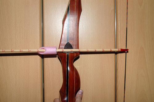 • Een manier om je treklengte te bepalen is door een schacht die voorzien is van een markering en een nok op je boog te spannen en aan te trekken.