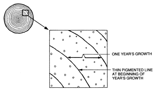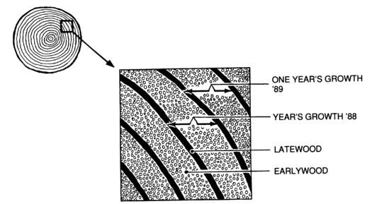- wanneer een houtsoort ringvatig is, ziet men op de kopse kant lichte en donkere groeiringen. Dit is het gevolg van het feit dat de houtcellen in het voorjaar groter zijn (= vroeghout, heeft meer diktegroei(Engels: earlywood)) en kleiner tot minimaal in het najaar (= laathout, weinig diktegroei of winterstop (Engels:latewood)). Dit komt dus enkel voor bij hout uit gematigde streken. Tropisch hout is meestal verspreidvatig: daar zijn geen seizoenen en is de groei het hele jaar door gelijkmatig.