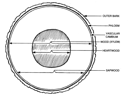In de doorsnede van een stam zien we van buiten naar binnen: