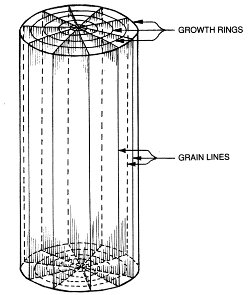* Een stam kan beschouwd worden als een cilinder. Een cilinder wordt gekarakteriseerd door een as (axis) en een straal (radius). De doorsnede van een cilinder is een cirkel. De raaklijn van een cirkel wordt de tangens genoemd. Bij hout worden de verschillende richtingen en vlakken aan de hand van die termen gedefinieerd: