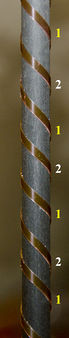 • Het resultaat is een schacht voorzien van dubbelzijdige tape waar de twee spiralen elkaar afwisselen. Op de foto is aangeduid waar de veren (1 en 2) zullen komen.