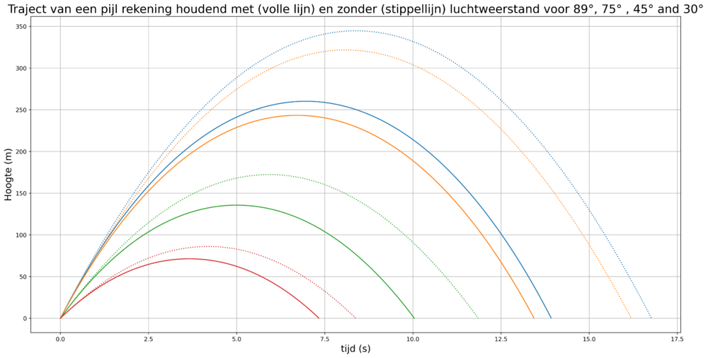 # my_title='Traject van een pijl rekening houdend met (volle lijn) en zonder (stippellijn) luchtweerstnad voor 89°, 75° , 45° and 30°'
