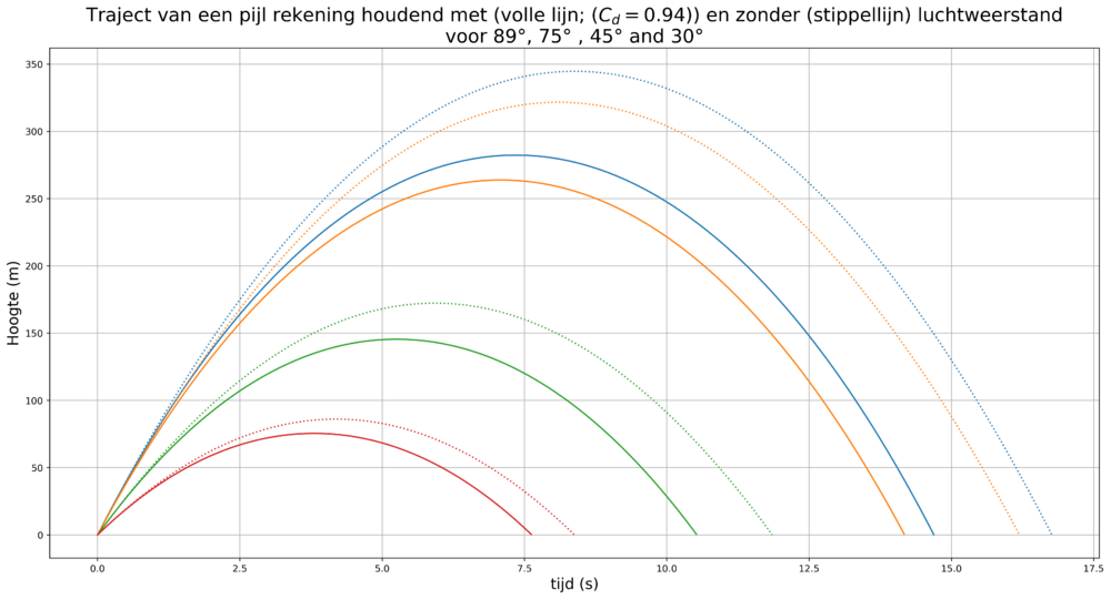 # my_title='Traject van een pijl rekening houdend met (volle lijn) en zonder (stippellijn) luchtweerstnad voor 89°, 75° , 45° and 30°'