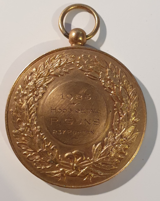 Op onderstaande gouden medaille won de heer P. Guns in 1925 het 'hoog getal' met 237 punten.