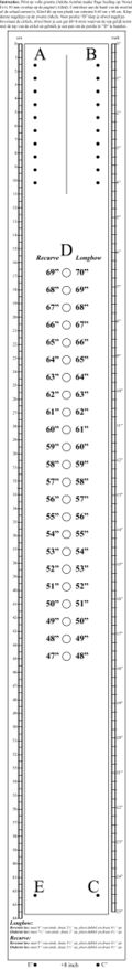 - De peeslengte zou dus 66.5"-3"=63.5" moeten zijn. We hebben geopteerd voor een pees van 64", volgens de "longbow" instellingen.(eerste markering in punt "D"=70").