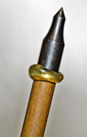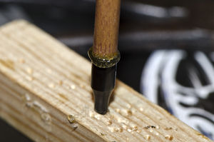 Plaats de punt stevig in de tang geklemd en plaats de punt op een stukje hout. Breng de schacht in een draaiende beweging over de insert. Druk de punt goed aan en laat de lijm koud worden.