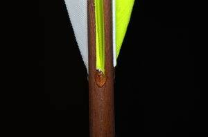 Op alle veren wordt bovenaan en onderaan een druppeltje lijm gelegd zodat ze niet gemakkelijk kunnen loskomen wanneer ze bv onder het gras gaan of wanneer er een andere pijl langs gaat. De druppel op de foto lijkt groot, maar na het opdrogen blijft er bijna niets meer van over.