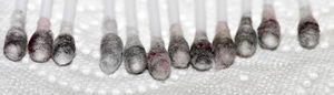 Maak met een wattenstaafje gedoopt in aceton de binnenkant van de schachten volledig proper. Dit is erg belangrijk.. zorg dat er geen stof noch vet achterblijft in de schacht. Breng wat aceton aan op het wattenstaafje en ga goed diep met het wattenstaafje en maak zowel een draaiende beweging met de schacht als met het wattenstaafje.. Maak elke schacht 3x zuiver en gebruik telkens een nieuwe kant van een wattenstaafje.