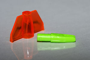 Hier in het voorbeeld is het de "EASTON Super Nock". Er wordt meestal een hulpmiddel mee verkocht waarmee je de nokken goed kan aligneren t.o.v. de index veer. Het hulpmiddel past net over de nock.