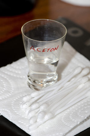 - Let op, aceton kan de schacht beschadigen en gebruik enkel aceton bij schachten die dit verdragen. Idem voor MEK (Methyl-Ethyl-Keton). De meeste fabrikanten raden het gebruik van een zeepoplossing aan.