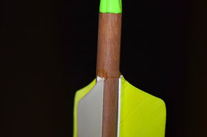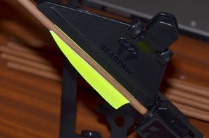 | Plaatsing in helical (bekeken vanuit de nok) (1°-3°) | Frontaal deel van de veer naar links t.o.v. midden van de schacht. Gebruik enkel de fletching jig waar LH op staat. | Frontaal deel van de veer naar rechts t.o.v. midden van de schacht. Gebruik enkel de fletching jig waar RH op staat. |