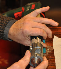 Zet het boormachine aan en laat het op een relatief trage stand (voor zacht hout) draaien. Met ervaring leer je hoe snel je de boor manueel kan laat draaien. Maak het conische gat liefst in het reparatiestuk (voorste deel van de pijl), dan schuift bij de impact het doel over de rand van de verbinding en niet ertegen. Gebruik niet te korte stukjes want dan wordt het fixeren met de vingers moeilijk.