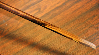 Na het drogen is de schacht terug klaar voor gebruik en kan die op lengte gezaagd en van een punt voorzien worden. Er dient een erg groot oppervlak afgeschuind te worden, dit om het oppervlak waarop de lijm kan aanhechten zo groot mogelijk te maken. Er komen namelijk erg grote krachten op dit oppervlak te staan, dus naast een goede sterke en waterresistente houtlijm is een groot oppervlak ook nodig om voldoende stevigheid aan de splice te geven.
