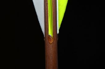 Op alle veren wordt bovenaan en onderaan een druppeltje lijm gelegd zodat ze niet gemakkelijk kunnen loskomen wanneer ze bv onder het gras gaan of wanneer er een andere pijl langs gaat. De druppel op de foto lijkt groot, maar na het opdrogen blijft er bijna niets meer van over. Een klein druppeltje lijm zoals de Bohning Fletch-Tite Platinum werkt erg goed. Zorg dat er een lijm is op zowel de schacht als het voetje van de veer.