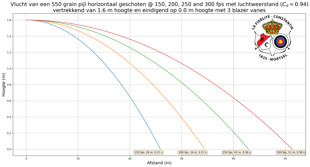 - Wat is de afstand die een pijl aflegt wanneer die horizontaal wordt afgeschoten? Dit is uiteraard afhankelijk van de verstreksnelheid en wordt weergegeven in de grafiek hieronder. Opmerkelijk is dat een snelle pijl (300 fps) slechts 51 meter aflegt.
