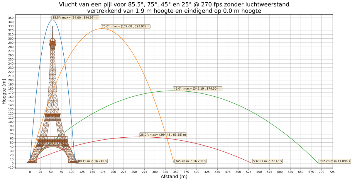 - Spoiler: een 700 grain pijl aan 305 fps afgeschoten onder een hoek van 86° zou er nog net (332m) over vliegen en aan de andere kant van de voet van de Eifeltoren landen. Warning: do not try this at home.. or in Paris!