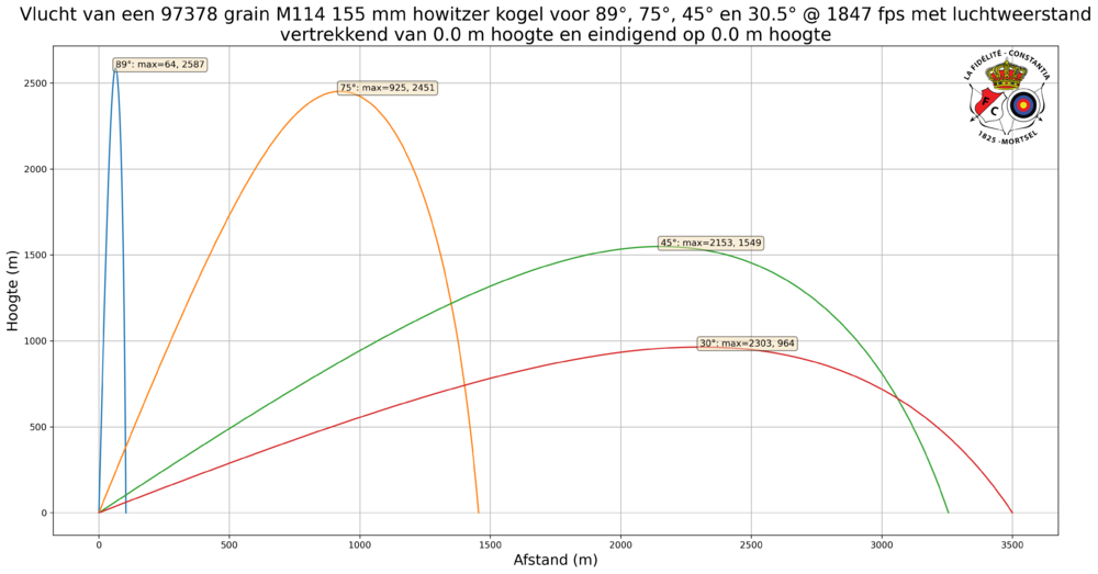 Voor een M114 155 mm howitzer kogel schiet je het verste onder een hoek van 30.5°. Dit in de veronderstelling dat de drag coefficiënt 0.295 is.