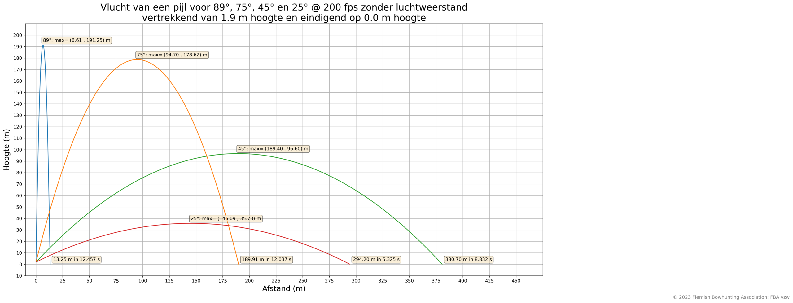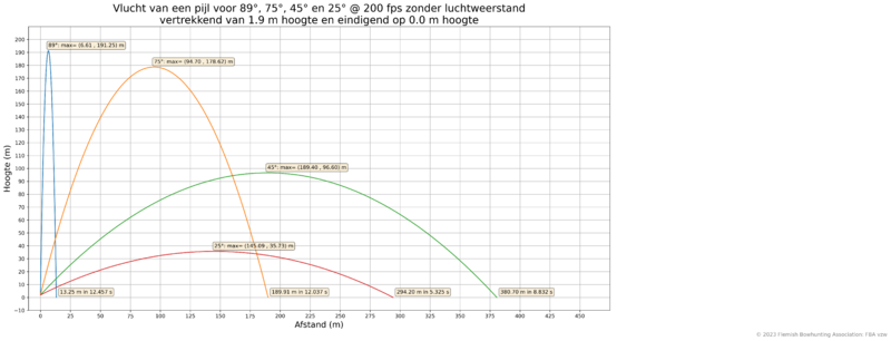 Vluch van een pijl aan 200 fps zonder luchtweerstand.