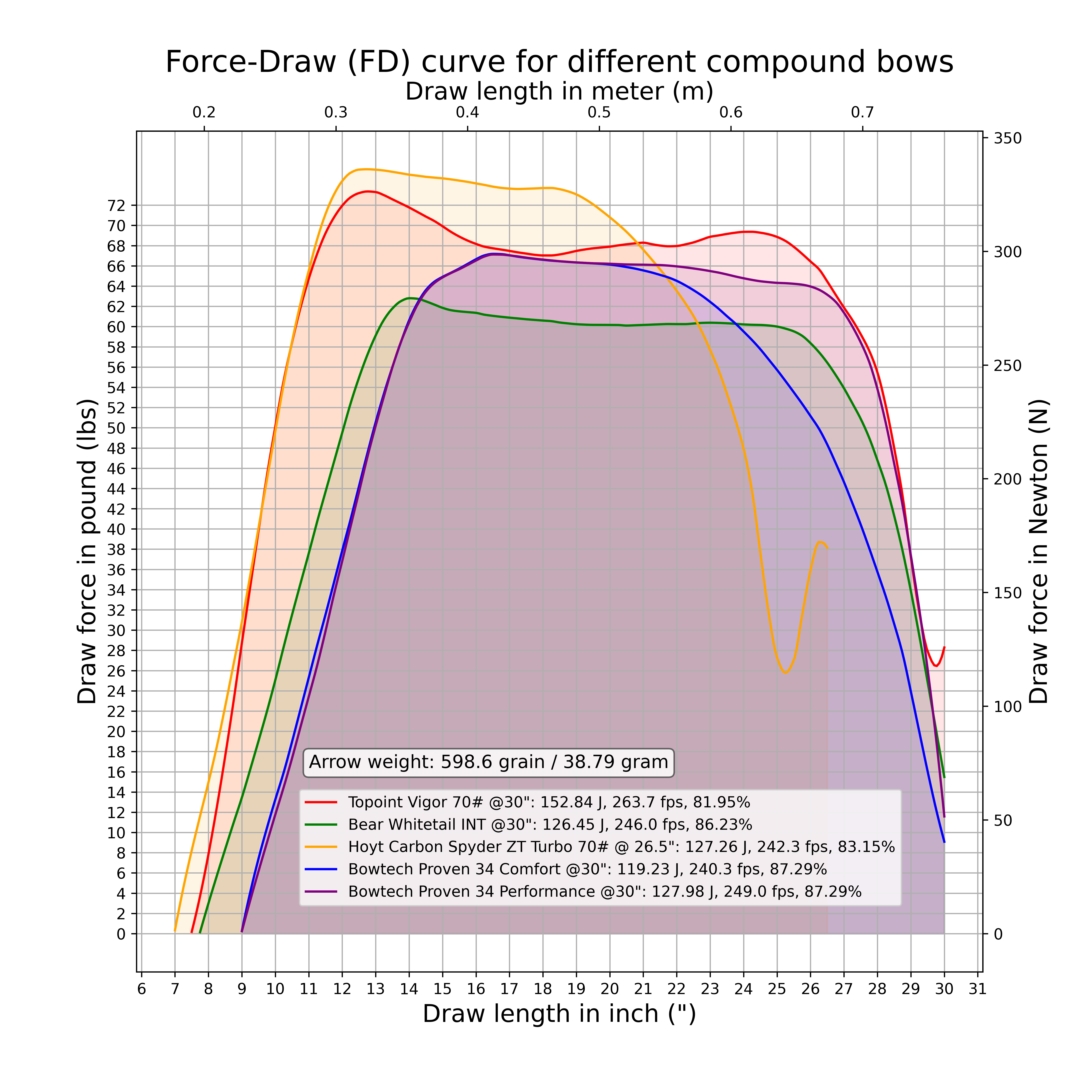 Force Draw curves of: Topoint Vigor 70# Bear Whitetail INT 60# Hoyt Carbon Spyder Turbo 70# Bowtech Proven 34 70# comfort modus Bowtech Proven 34 70# performance modus