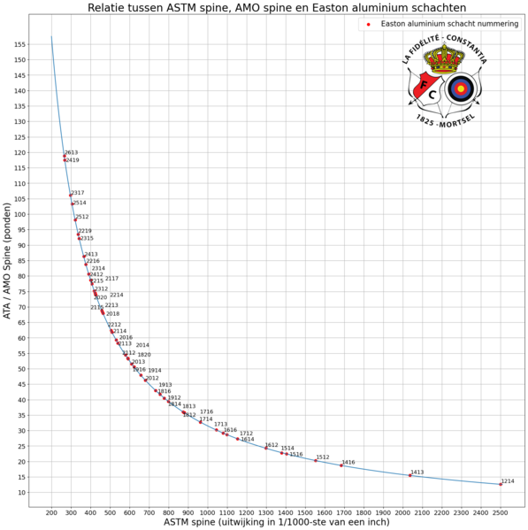 Relatie tussen ASTM spine, AMO spine en de Easton nummering voor aluminium schachten.